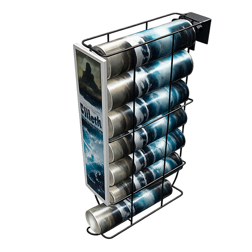 Exhibidor metálico para rollos diseñado para exhibición y almacenamiento en punto de venta. Ayuda a ordenar el producto, mejorar la visibilidad y fortalecer la marca gracias a su panel lateral personalizable. Ideal para negocios que manejan material en rollo y buscan una exhibición más limpia, resistente y profesional
