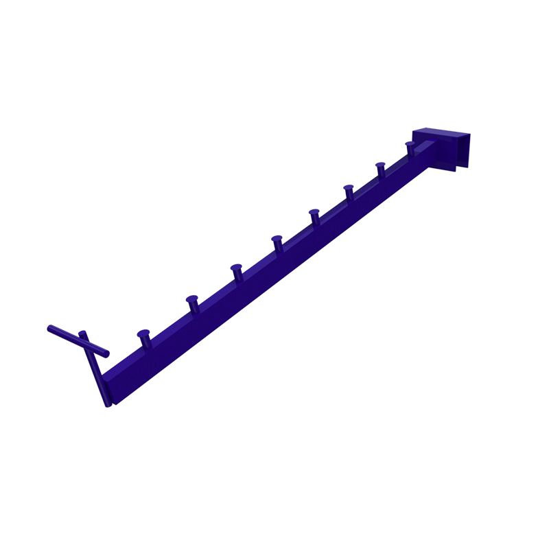 La flauta metálica con caja y tope frontal es una solución funcional para sistemas de exhibición en retail, diseñada para colgar productos de forma segura y organizada. Su estructura incorpora puntos para ganchos y un tope frontal que evita la caída o desplazamiento de los productos.